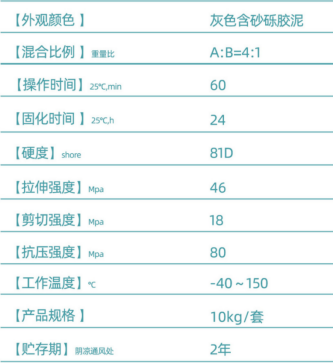 4、配比后材料需30分钟内用完;施工环境湿度≤75%,避免雨雾污染;固化前遮挡灰尘,防止杂质混入;完全固化后可投入使用,正常工况下无需额外维护。