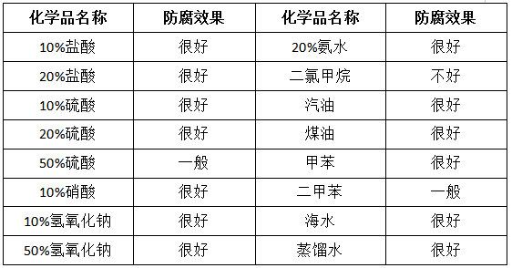 注:测试方法为25℃固化后7天的样块浸泡在化学品30天的结果。